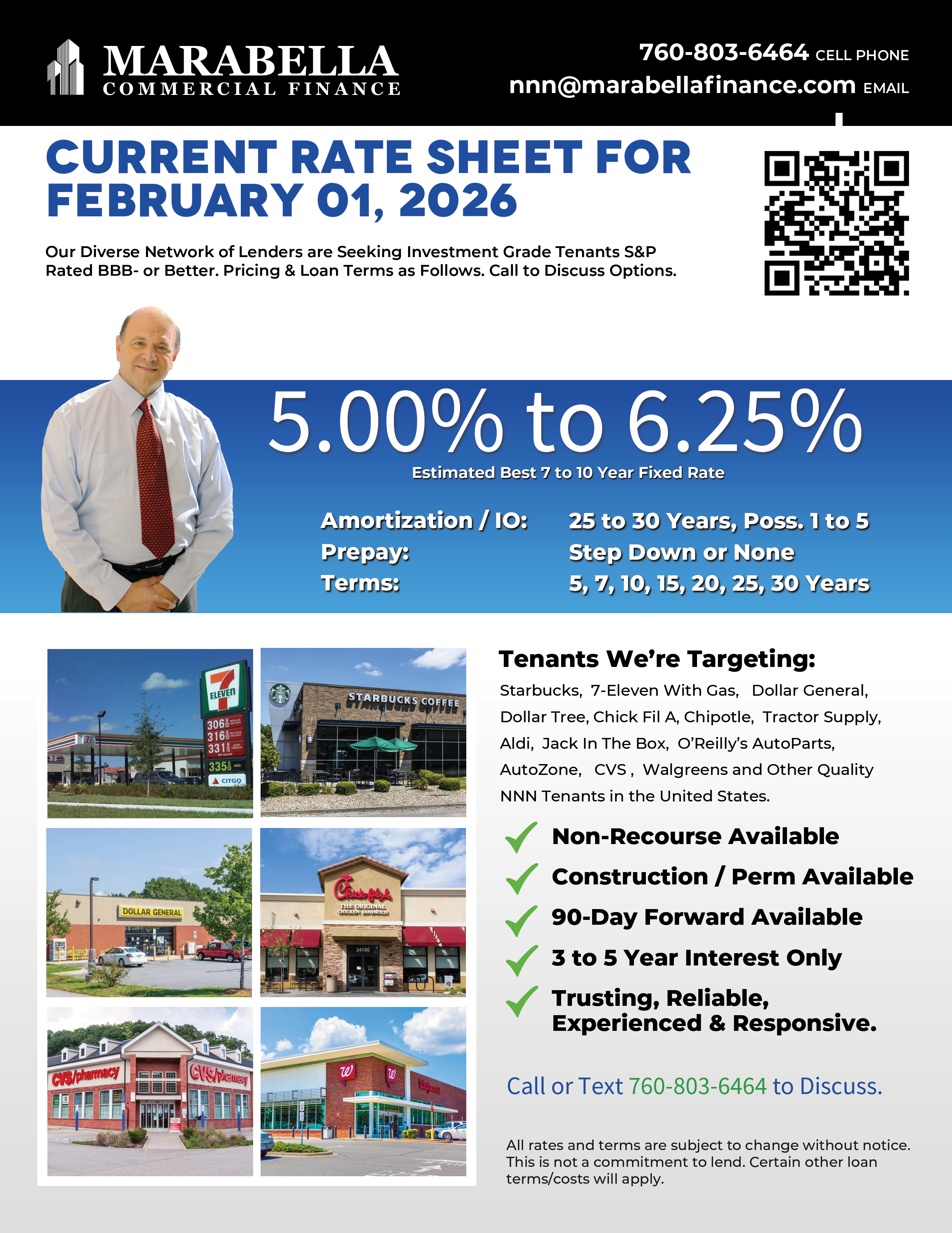 Additional terms and conditions may apply. Rates are subject to change without notice. Detailed rate sheets for specific credit tenants are available. For a fast rate quote and free consultation, contact our office by phone at (760) 479-0800 or by using the rate request form.